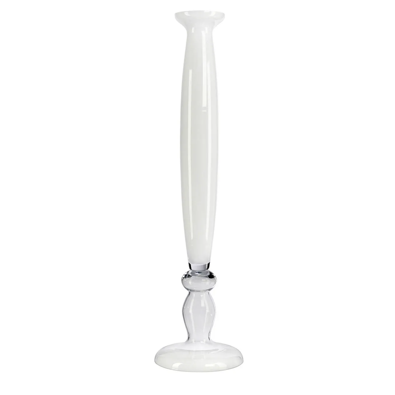 Questo prezioso vaso sarà un’affascinante aggiunta a un ingresso o a un salotto moderno. Realizzato a mano da esperti artigiani con tecniche tradizionali di lavorazione del vetro, vanta una silhouette sottile e levigata che combina una base in vetro trasparente con un corpo in vetro bianco per un’estetica senza tempo.
