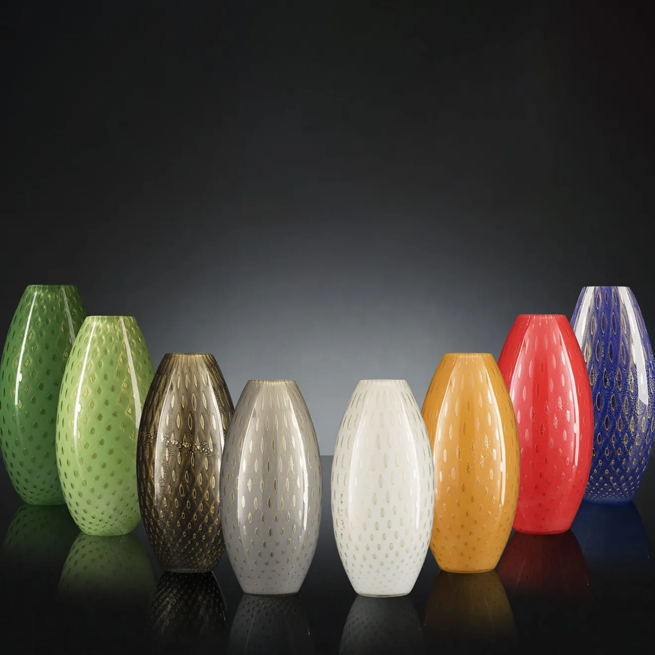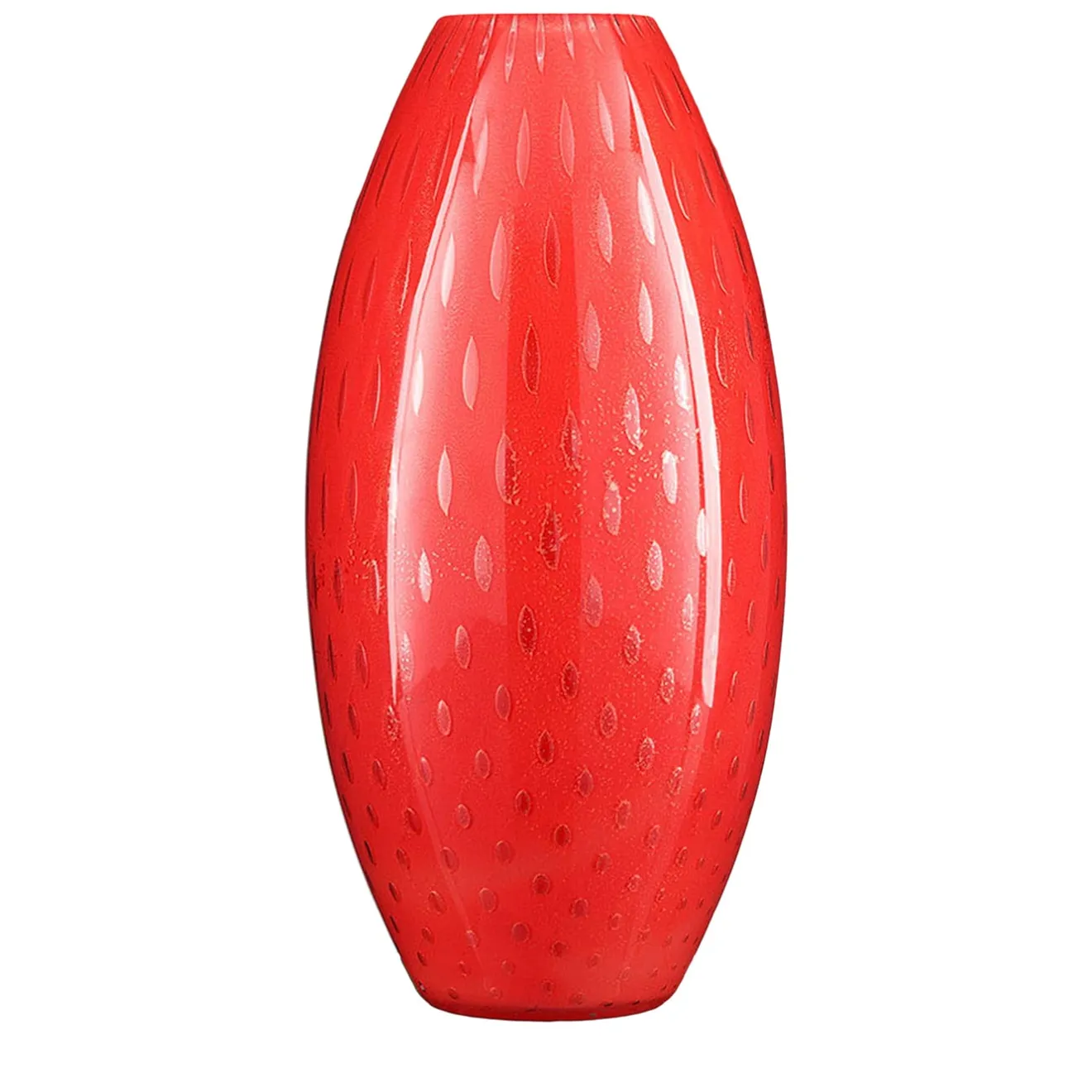 Una silhouette pulita e generosa che spicca per la vibrante colorazione rossa definisce questo singolare vaso. Accuratamente soffiato a bocca dal pregiato vetro di Murano, sfoggia un ampio motivo di gocce d’oro scintillanti che gli conferiscono una delicata lucentezza. Esclusivo e seducente, sarà la soluzione ideale per ravvivare gli interni.