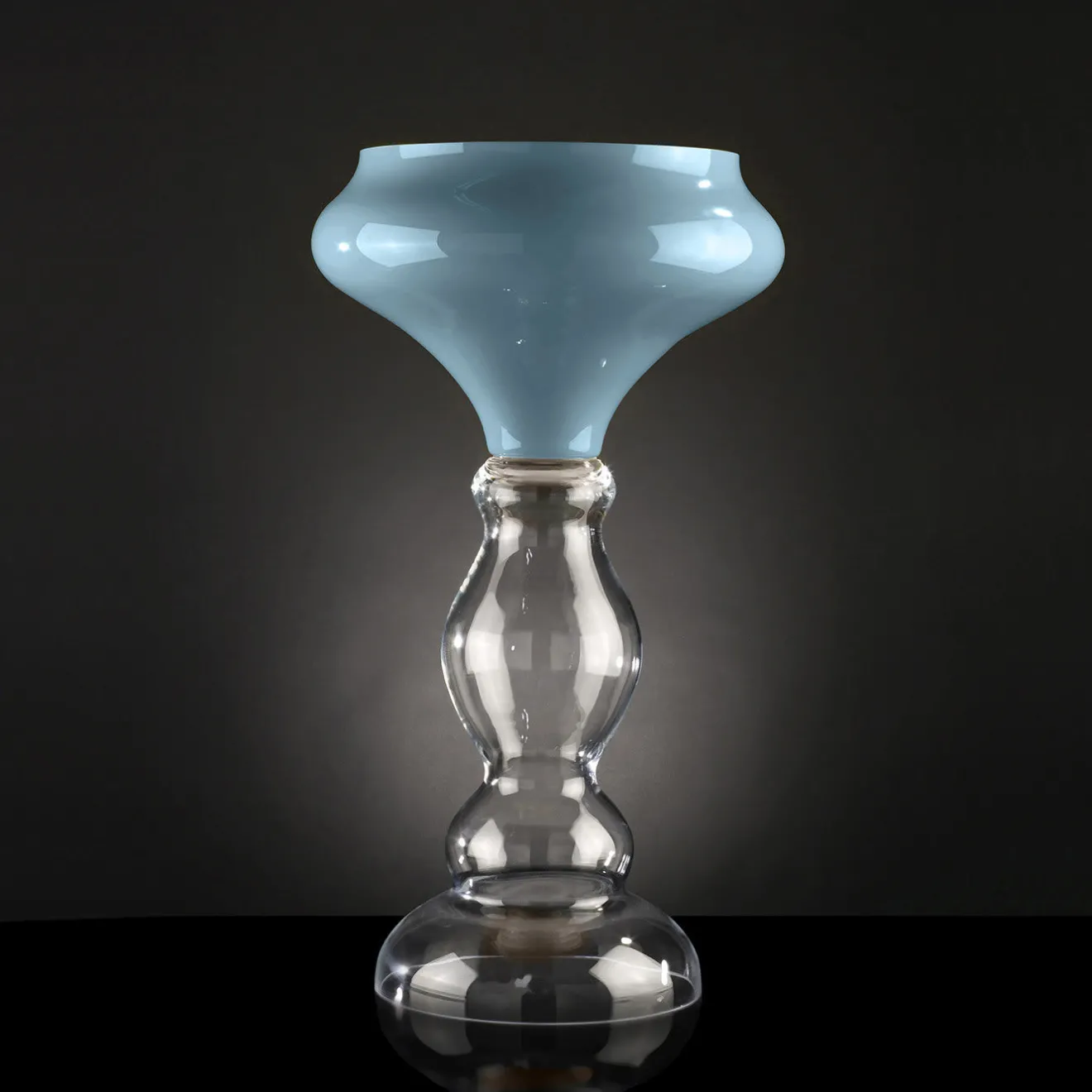 Caratterizzato da una raffinata silhouette a forma di calice arricchita da linee morbide e sinuose, questo vaso è un pezzo forte dell’arredamento moderno e funzionale. Poggiato su un alto stelo trasparente, il calice del vaso si distingue per il colore blu purista che gli conferisce una qualità unica.
