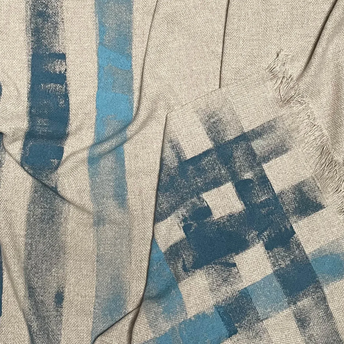 Pennellate sbiadite che tracciano strisce in diverse tonalità di blu caratterizzano il singolare fascino artistico di questa coperta con frange. Magistralmente tessuta a mano in pregiato cashmere beige da abili artigiani comaschi, garantisce la massima morbidezza e calore che si aggiungono al suo sofisticato design dipinto a mano. L’intero processo di lavorazione artigianale implica la sua esclusività. Si prega di lavare solo a secco.