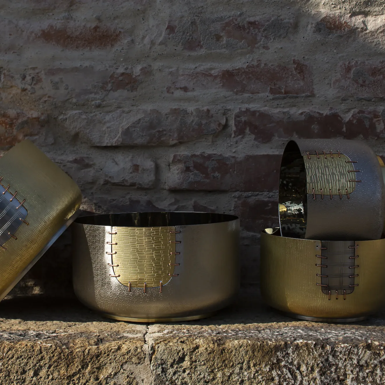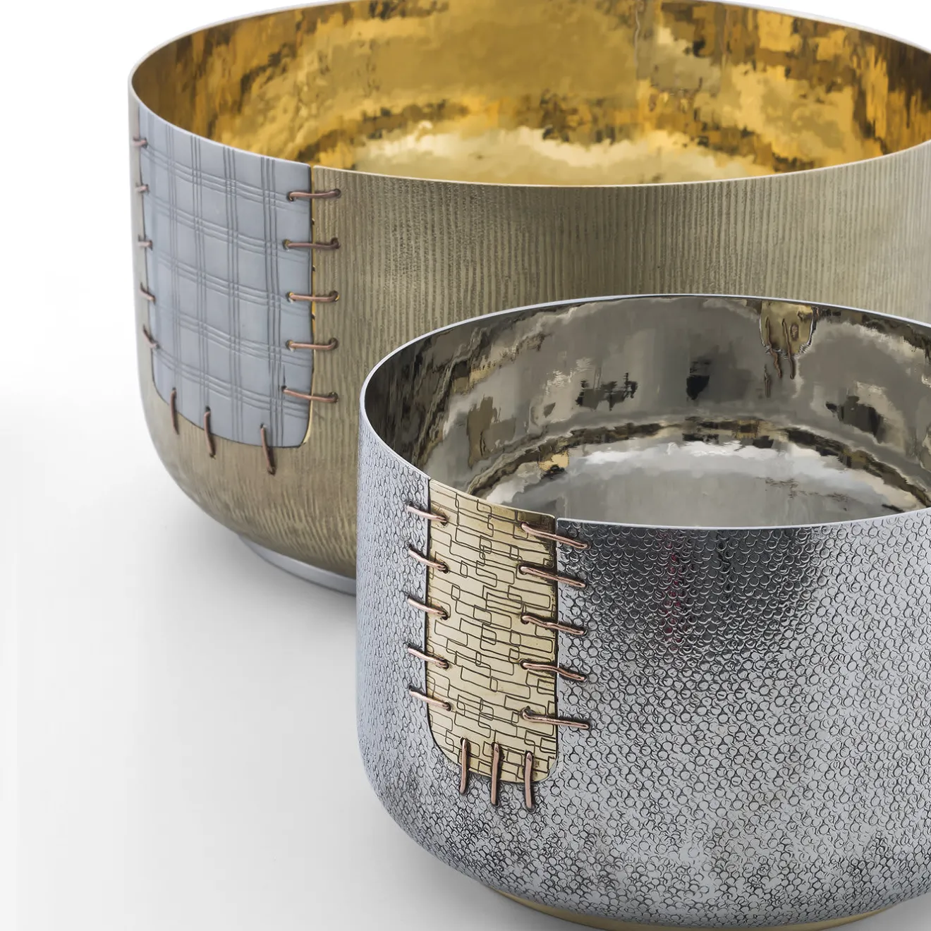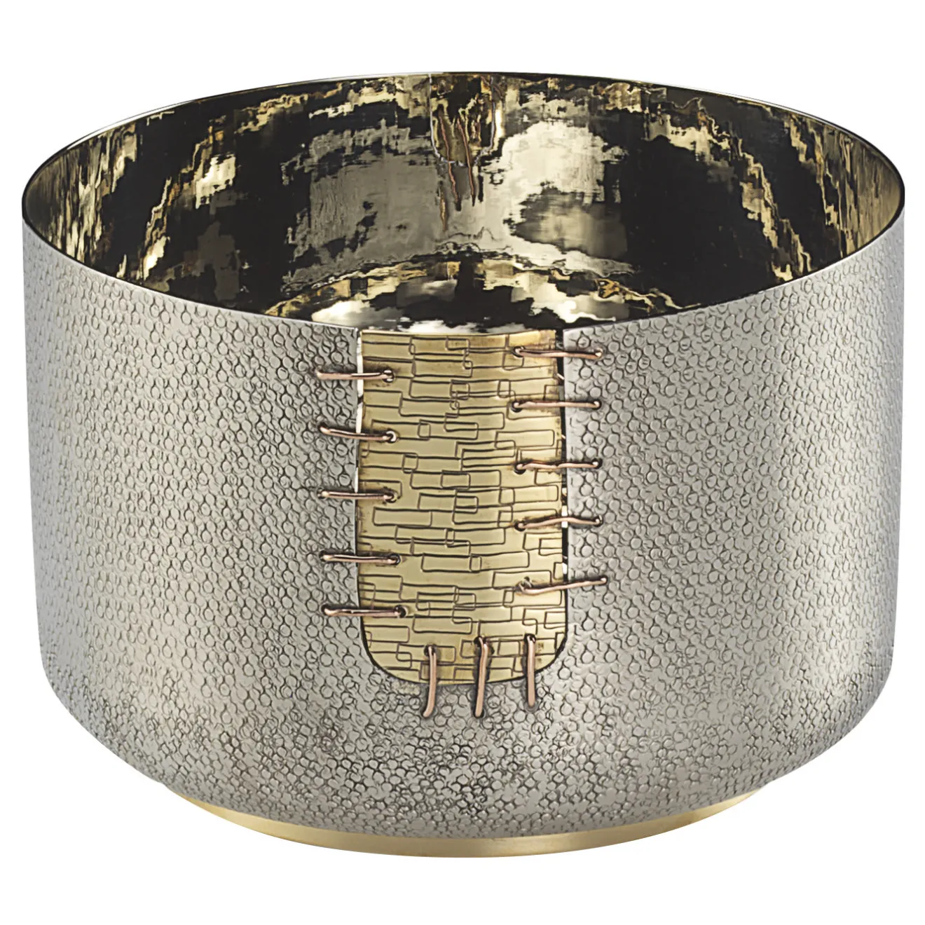 Questa ciotola è un’aggiunta versatile e sorprendente a qualsiasi casa moderna dove, sia come vaso che come centrotavola, farà la sua figura. La sua semplice silhouette è ornata da una toppa decorativa che sembra essere stata cucita. Parte di una serie limitata, il rame, il bronzo bianco e l’ottone utilizzati riflettono la luce circostante in modo unico, mentre la toppa simboleggia la ricerca di riparare e non buttare via gli oggetti rotti, secondo la filosofia giapponese del Kintsugi.