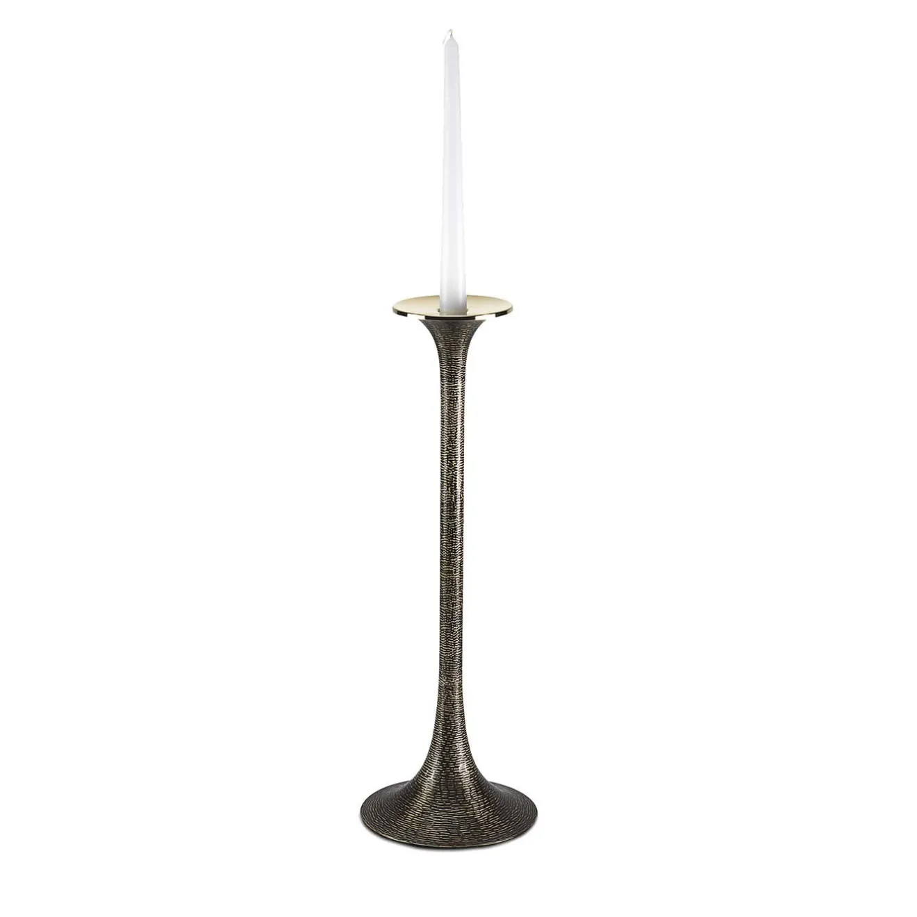 Questo elegante vaso-candela doppio è una testimonianza di design minimalista. Realizzato in ottone con una texture martellata che esalta la finitura brunita dell’esterno, il pezzo vanta una silhouette elegante con curve e creste audaci: la parte superiore e la base hanno lati inclinati che formano un fusto alto e sottile. Il piano del bobeche può essere rimosso per trasformarsi in un vaso. Adatto sia agli interni moderni che a quelli classici, questo pezzo si presta a essere collocato in serie su una credenza o come centrotavola in una sala da pranzo. Disponibile in quattro dimensioni e in diversi materiali, si prega di contattare il Concierge per i dettagli.